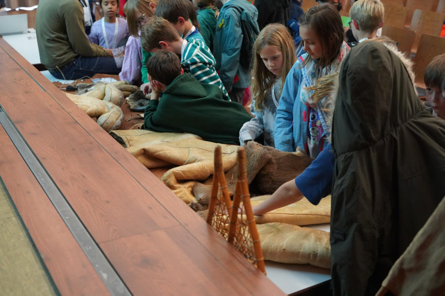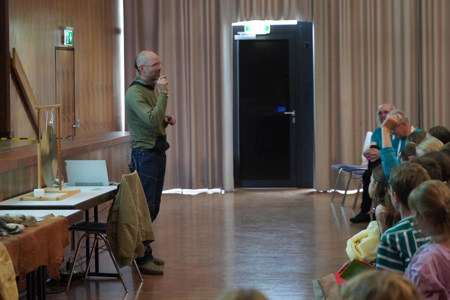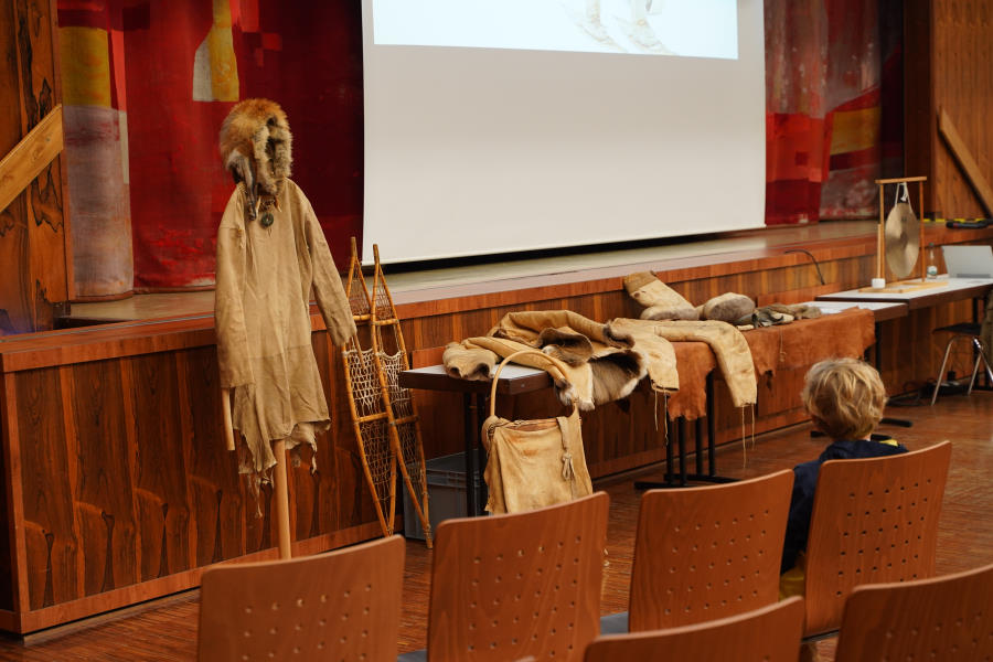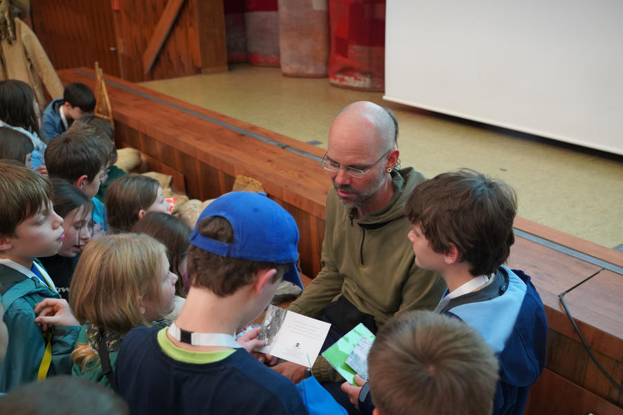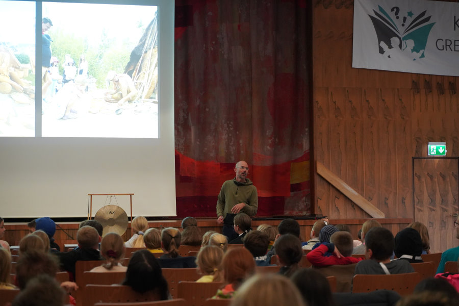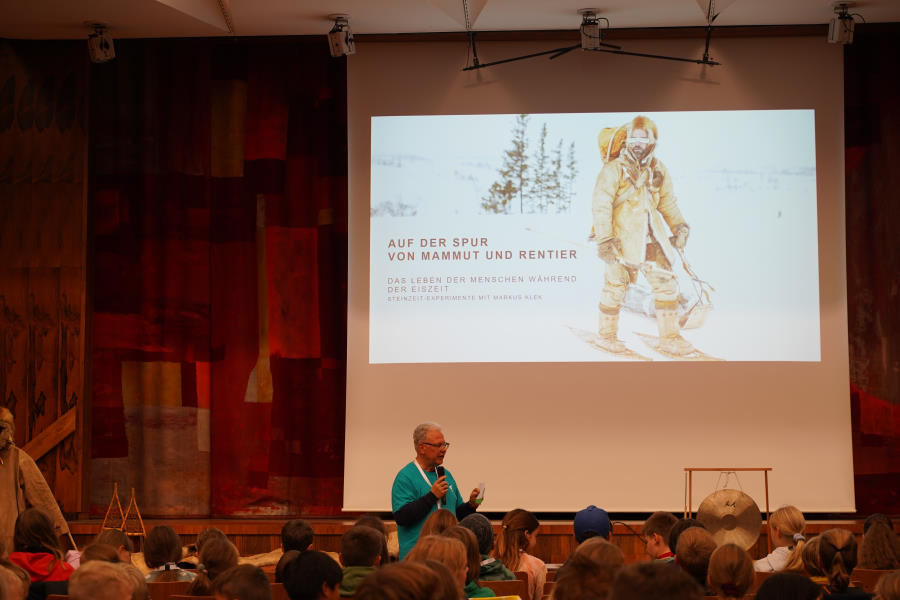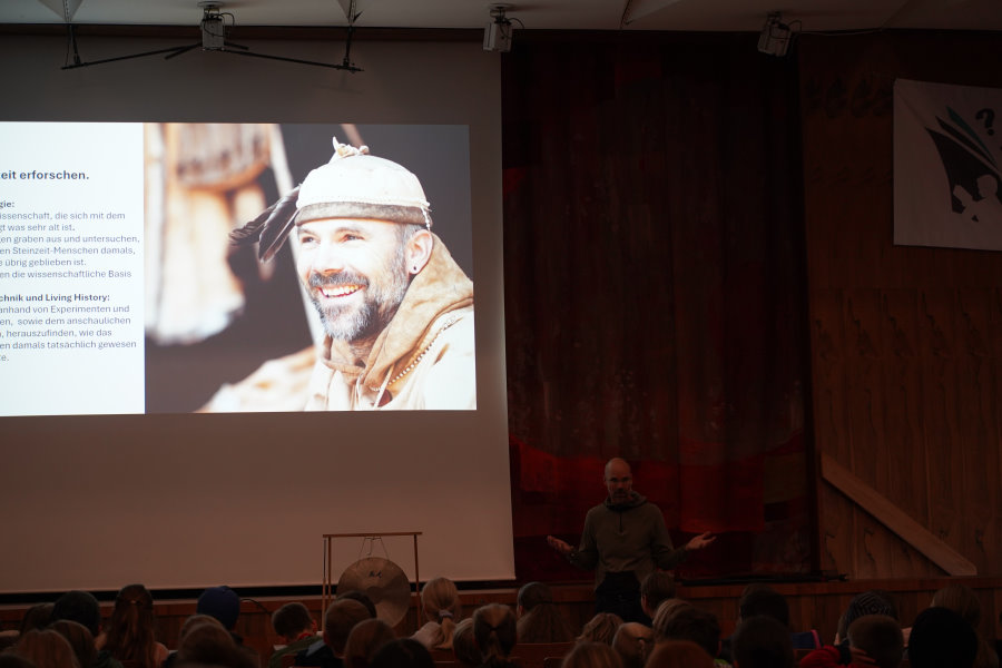 Außerdem bringt er seine gesamte, selbstgefertigte Steinzeitausrüstung zum Anschauen und Anfassen mit.